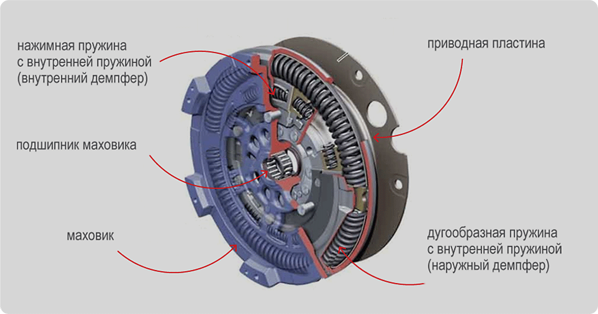 Двухмассовый (или демпферный, двухдисковый, двухсекционный) маховик расположен между сцеплением и непосредственно самим двигателем. Состоит он из двух корпусов. Один из корпусов обладает установленным венцом стартера, который присоединен к коленчатому валу. Другой — узлом сцепления. Два корпуса соединены друг с другом за счет специальных подшипников скольжения. Но кроме этого еще и происходит их вращение относительно друг друга. Между ними имеется пружинный демпфирующий механизм Специальная смазка (консистентная), которая наполняет внутренний объем маховика делает работу пакетов пружин непрерывной. Чтобы не допустить блокировку пружин, пакеты поделены пластиковым сепаратором.